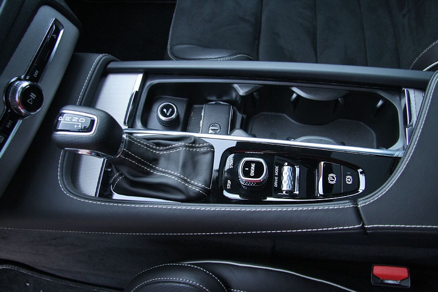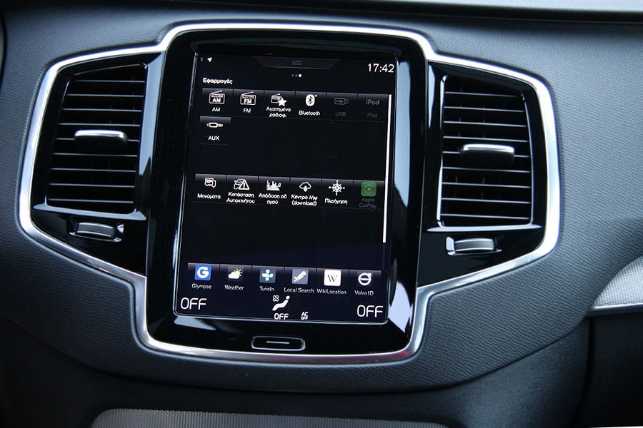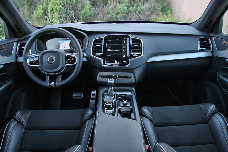 Περνώντας στο εσωτερικό του XC90, η εικόνα που εισπράττει άμεσα κανείς, είναι αυτή ενός πολυτελούς, ευρύχωρου και high-tech αυτοκινήτου. Το βλέμμα πέφτει απευθείας στη μεγάλη, κάθετα τοποθετημένη τύπου tablet οθόνη του συστήματος πολυμέσων, από όπου γίνεται ο έλεγχος όλων των λειτουργιών και συστημάτων του αυτοκινήτου. Ωστόσο, επειδή είναι πολλά τα μενού και οι επιλογές ο οδηγός χρειάζεται αρκετό χρόνο εξοικείωσης, αν και οι βασικές πληροφορίες φαίνονται στο αρχικό μενού (π.χ. ενδείξεις κλιματισμού, ραδιοφώνου, πλοήγηση και σύνδεση τηλεφώνου). Ψηφιακός είναι και ο πίνακας οργάνων (TFT Crystal Display) με έγχρωμη οθόνη υψηλής ανάλυσης 8 ιντσών και με ενδείξεις που αλλάζουν ανάλογα τις ρυθμίσεις που επιθυμεί ο οδηγός. Πίσω από τον επιλογέα ταχυτήτων υπάρχουν (τα όχι πολύ εύχρηστα) χειριστήρια Start/Stop του κινητήρα (μετακινείται δεξιά – αριστερά) και πιο πίσω το DriveMode, που λειτουργεί με πίεση και περιστροφή πάνω – κάτω. Ποιοτικά, τα υλικά, η συναρμογή και το φινίρισμα είναι υψηλού επιπέδου (αλλά όχι κορυφαία στην κατηγορία των premium SUV).