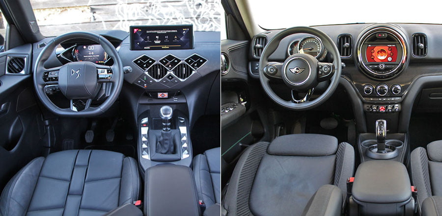 Το εσωτερικό του DS 3 Crossback, ενστερνίζεται το μοτίβο του ρόμβου, ενώ το MINI συνεχίζει στη ρετρό λογική που διακρίνει τα μοντέλα της μάρκας. Επίσης, συγκριτικά με το πολύ προσεγμένο σε κατασκευή DS 3 Crossback έχει ένα μικρό προβάδισμα στον τομέα της ποιότητας. Από την άλλη το γαλλικό αυτοκίνητο θα απαιτήσει λίγο παραπάνω την προσοχή σας σε ότι αφορά την εξοικείωση με τα τεκταινόμενα της καμπίνας. Κι αυτό γιατί υπάρχουν πολλά κουμπιά, τόσο στη κεντρική κονσόλα, όσο και περιμετρικά του επιλογέα. Αμφότερα διαθέτουν οθόνες αφής, μέσω των οποίων ελέγχονται, πέρα από το infotainment, και διάφορες παράμετροι των αυτοκινήτων.