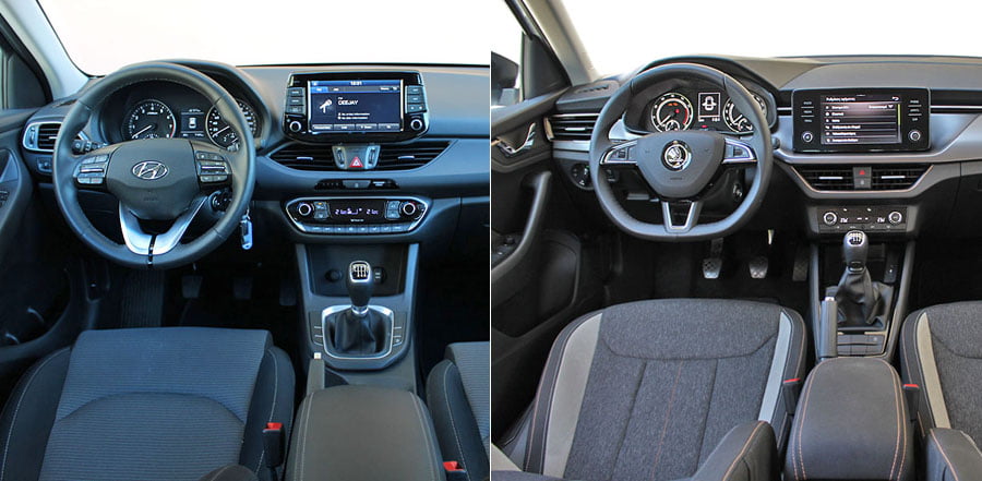 Από την πρώτη επαφή με τα δυο μικρομεσαία μοντέλα, θα διαπιστώσετε ότι έχουν κοινά σημεία, με πρώτο και κύριο αυτό της ποιότητας. Ξεκινώντας από το Hyundai, παρατηρούμε ότι διαθέτει ένα εκμοντερνισμένο εσωτερικό, με τεχνολογικές πινελιές. Στο μινιμάλ αισθητικής ταμπλό και στο άνω σημείο του δεσπόζει η οθόνη αφής των 8 ιντσών (δεν περιλαμβάνεται στις βασικές εκδόσεις) μέσω της οποίας ελέγχονται όλες οι λειτουργίες του infotainment. Στη μέση της κονσόλας υπάρχουν τα χειριστήρια για τον κλιματισμό, με τις προσφερόμενες θήκες να ικανοποιούν, τόσο σε πλήθος, όσο και σε χωρητικότητα για τα καθημερινά μικροαντικείμενα. Την πληροφόρηση του οδηγού αναλαμβάνουν δυο αναλογικά όργανα (στροφόμετρο – ταχύμετρο), όπου ανάμεσά τους υπάρχει η ευανάγνωστη οθόνη TFT 3,5 ιντσών του trip computer.