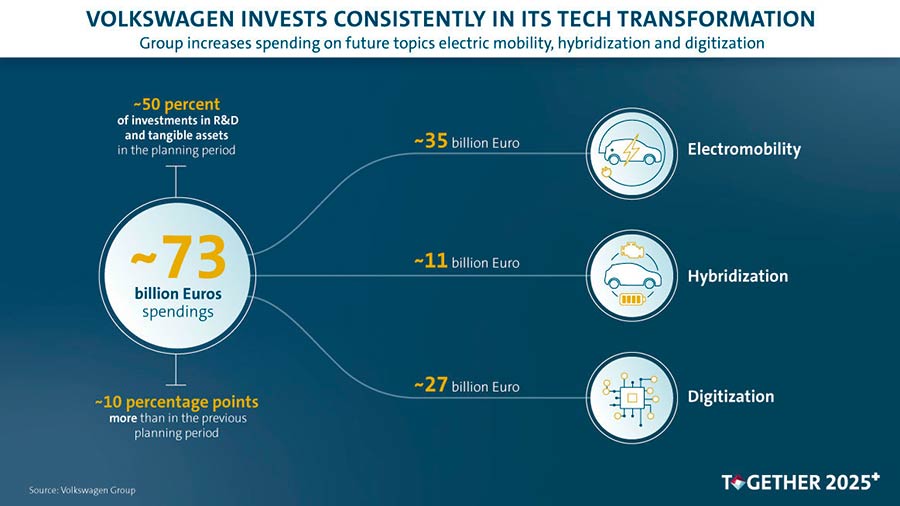 Ο όμιλος VW ανακοίνωσε παράλληλα ότι μέσα στην επόμενη πενταετία θα επενδύσει 73 δισεκατομμύρια ευρώ σε νέα οχήματα και τεχνολογίες, όπως 35 δις ευρώ για την ηλεκτροκίνηση, 11 δις ευρώ για υβριδικά σύνολα και 27 δις ευρώ για ψηφιοποίηση.