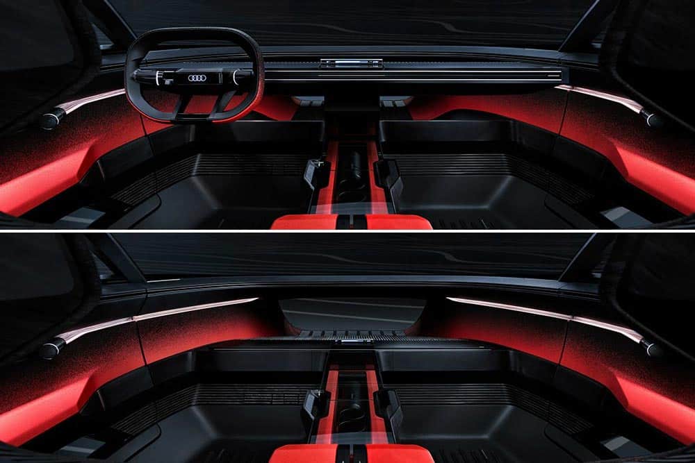 Στο εσωτερικό η είσοδος γίνεται εύκολα, χάρη στο μεγάλο άνοιγμα των θυρών που ανοίγουν με αντίθετη φορά. Όταν στο Audi activesphere ενεργοποιείται η αυτόνομη λειτουργία, το τιμόνι, το ταμπλό και τα πεντάλ εξαφανίζονται. Έτσι στην πρώτη σειρά των καθισμάτων ανοίγει ένας άπλετος χώρος μπροστά. Το ίδιο το ταμπλό λειτουργεί σαν μια μεγάλη μπάρα ήχου καθώς και ως έξυπνος αερισμός πλήρους πλάτους τόσο στη θέση ανάπτυξης όσο και στη θέση αποθήκευσης. Τα χειριστήρια χωρίς αφή MMI στις πόρτες είναι πάντα προσβάσιμα στο μάτι και το χέρι, για παράδειγμα για τον έλεγχο των παραθύρων και των ρυθμίσεων καθισμάτων.