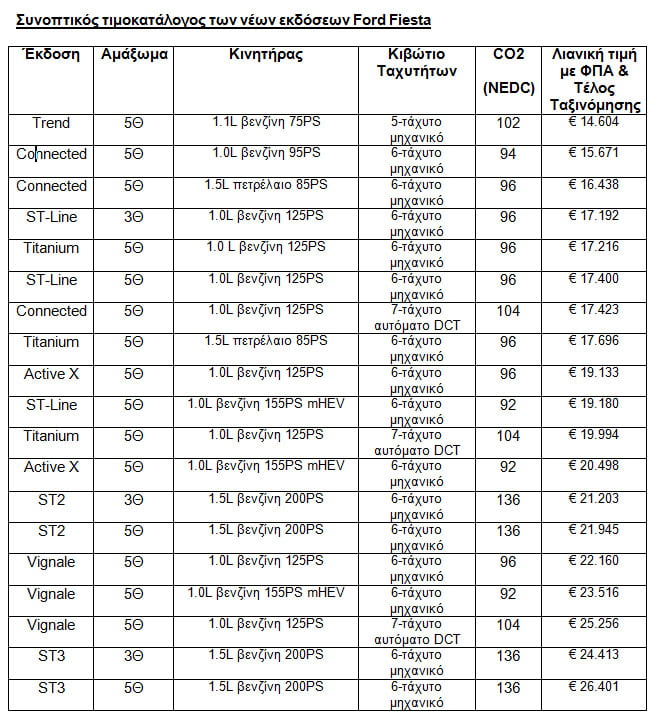 Παράλληλα με το υβριδικό σύστημα κίνησης και την έκδοση με το προηγμένο αυτόματο κιβώτιο διπλού συμπλέκτη της Ford, το νέο Fiesta διατίθεται στην Ελλάδα σε νέες, ακόμη πιο πλούσια εξοπλισμένες εκδόσεις, που περιλαμβάνουν προηγμένες τεχνολογίες αυτόνομης οδήγησης επιπέδου 2, καθώς και συστήματα, όπως τα Adaptive Cruise Control με σύστημα Stop & Go, Speed Sign Recognition και Pre-Collision Assist. Συνολικά, το νέο Fiesta διαθέτει 15 τεχνολογίες ασφάλειας και υποβοήθησης της οδήγησης που κάνουν την οδηγική εμπειρία πιο άνετη, λιγότερο απαιτητική και ασφαλέστερη.