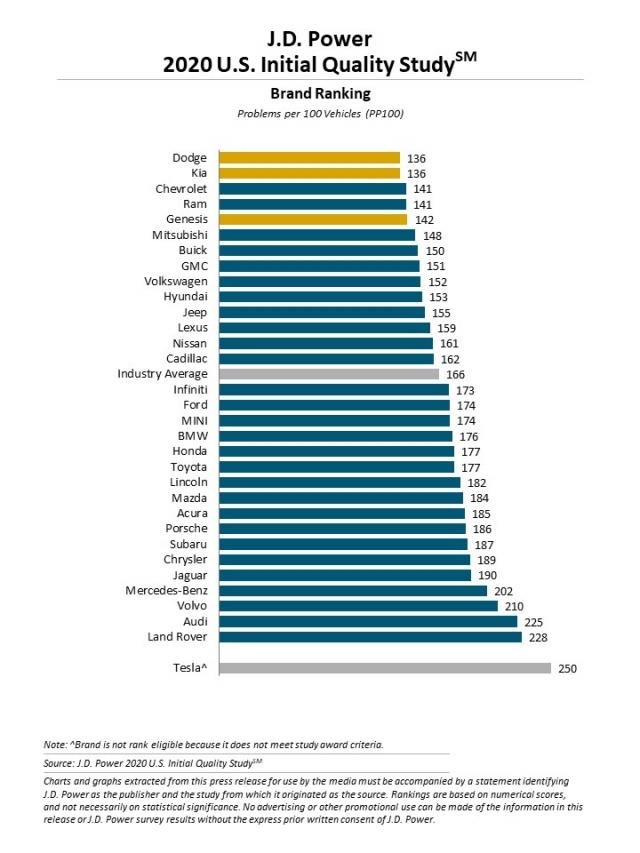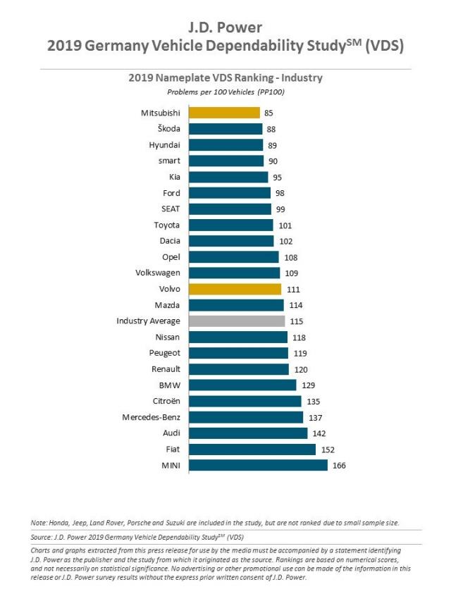 Σύμφωνα με την έρευνα της Reliability Index και οι τρεις premium γερμανικές μάρκες βρίσκονται χαμηλά στην κατάταξη, με τη Mercedes στην 30η θέση, την BMW να είναι μια θέση παρακάτω και την Audi στην 34η θέση (μεταξύ των 40 μαρκών αυτοκινήτου). Αντίστοιχα και στις έρευνες της J.D. Power (δεν έχουν ανακοινωθεί για το 2020 για Γερμανία και Μ. Βρετανία), οι εν λόγω μάρκες τοποθετούνται κάτω από το μέσο όρο, με περισσότερα προβλήματα ανά 100 οχήματα, σε σχέση με άλλες mainstream εταιρείες. Στις Η.Π.Α. μάλιστα, η πολυτελής μάρκα της Hyundai, η Genesis έκανε την έκπληξη και πέρασε και την Lexus, η οποία ήταν παραδοσιακά στις πρώτες θέσεις.