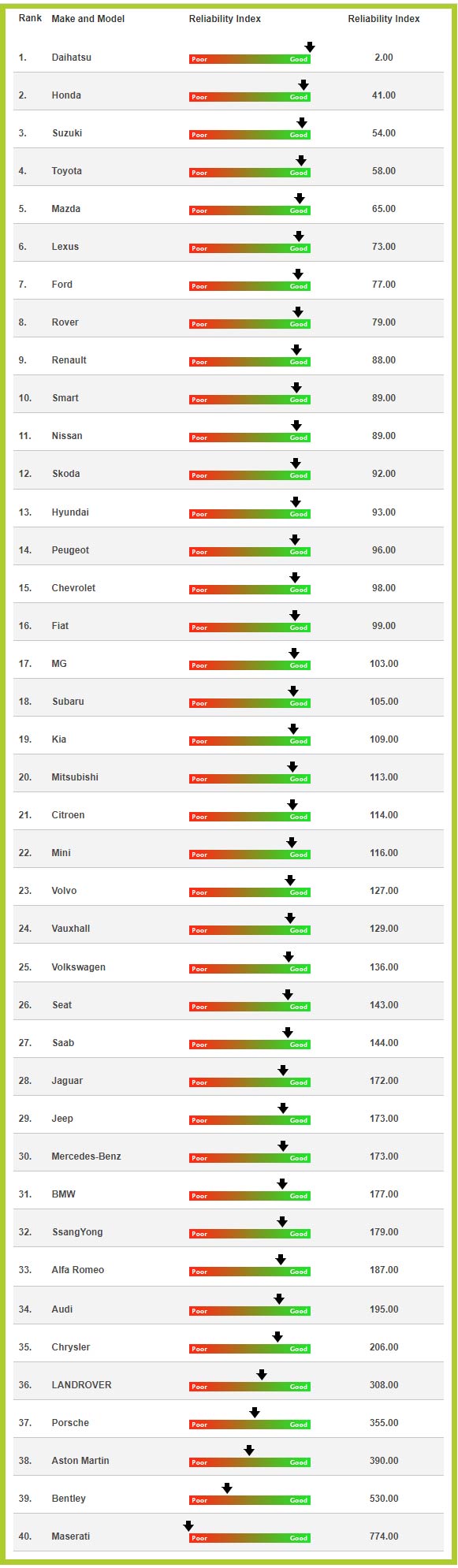 Από τα μικρότερα μοντέλα τους, έως τα μεγάλα πολυτελείας και τα SUV ανεβάζουν συνεχώς ψηλά τον πήχη σε πολλούς τομείς και αποτελούν σημεία αναφοράς. Το μοναδικό όμως στοιχείο που δεν φαίνεται ή δεν είναι άμεσα μετρήσιμο, είναι η αξιοπιστία και η εμφάνιση βλαβών. Γι αυτό φροντίζουν μεγάλες εταιρείες που κάνουν έρευνες πάνω στο νευραλγικό αυτό τομέα και ανακοινώνουν τα αποτελέσματά τους. Η J.D. Power είναι μία από αυτές που δημοσιεύει αναφορές για τις Η.Π.Α., Μ. Βρετανία και Γερμανία, καθώς και η βρετανική Reliability Index. H J.D. Power ανακοινώνει τα προβλήματα που αντιμετώπισαν οι ιδιοκτήτες των οχημάτων κατά τη διάρκεια των τελευταίων 12 μηνών, ύστερα από 12-36 μήνες ιδιοκτησίας, ενώ η Reliability Index έχει μια βάση δεδομένων πάνω από 50.000 αναφορών, η οποία συνεχώς ανανεώνεται (μέσος όρος είναι το 100).