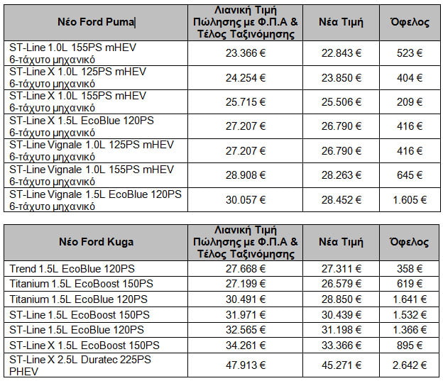 Το νέο μικρό SUV Puma και το επίσης ολοκαίνουργιο μικρομεσαίο SUV Kuga, είναι τώρα διαθέσιμα στη χώρα μας με νέες, ακόμα πιο ελκυστικές τιμές, μετά τις πρόσφατες αλλαγές στον τρόπο υπολογισμού του τέλους ταξινόμησης.