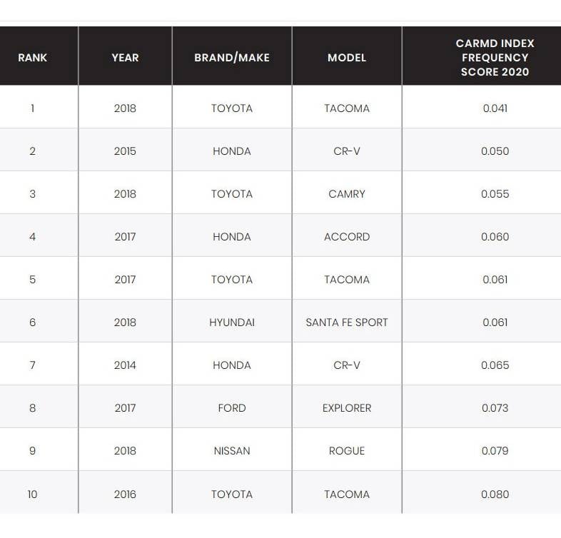 Τι μας λένε λοιπόν τα στοιχεία; Πρώτον, ότι ο μέσος όρος μιας μάρκας δεν αντικατοπτρίζεται στα επιμέρους μοντέλα. Η Toyota δεν είναι καν στο Top 10 ως εταιρία, όμως τα αυτοκίνητά της καταλαμβάνουν 4 από τις πρώτες 10 θέσεις. Τρεις εξ αυτών, το Tacoma σε διαφορετικές χρονολογίες. Με λίγα λόγια, μπορεί Tacoma και Camry να τα πηγαίνουν εξαιρετικά, όμως η υπόλοιπη γκάμα δεν τα ακολουθεί. Κάτι που ισχύει για την Honda και το CR-V.