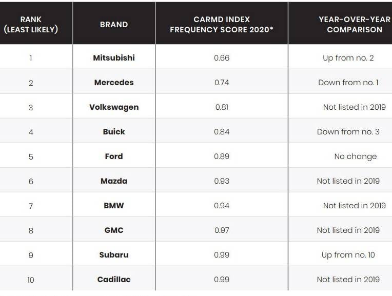 Το ακριβώς αντίθετο συμβαίνει με τη VW. Δεν υπάρχει ούτε ένα μοντέλο της στο αντίστοιχο Top 10, όμως ο μέσος όρος της σαν εταιρία την φέρνει στη 2η θέση! Αναλόγως, όλες οι υπόλοιπες φίρμες πλην Ford. Το «Μπλε Οβάλ» είναι η μοναδική εταιρία με παρουσία στην κατάταξη κατασκευαστών και μοντέλων, ούσα στην 5η θέση και έχοντας το Explorer στην 8η. Ακόμα και η Mitsubishi, που καταλαμβάνει την κορυφή, δεν έχει εκπρόσωπο στα μοντέλα!