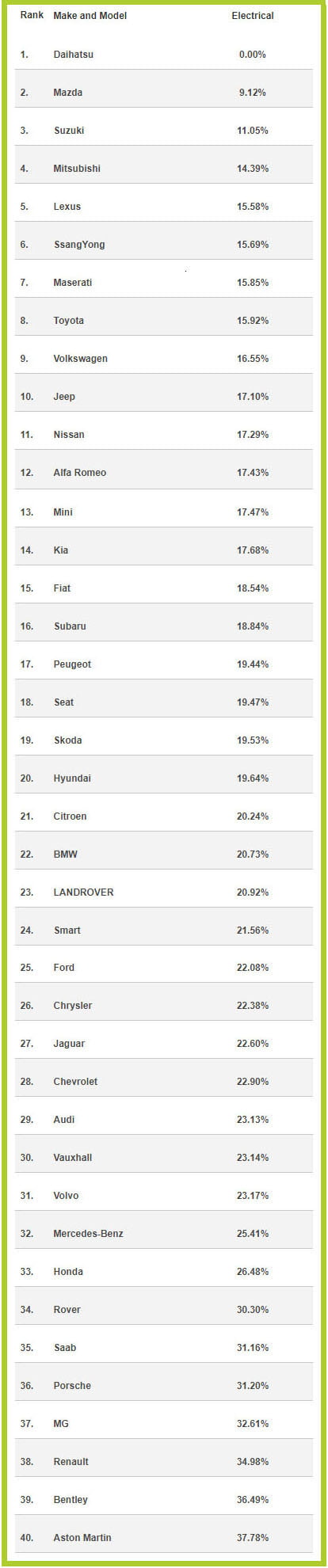 Ποιες μάρκες όμως εμφανίζουν τα λιγότερα και ποιες τα περισσότερα προβλήματα στα ηλεκτρονικά τους συστήματα; Μια εικόνα μας δίνει η εταιρεία βρετανική Reliability Index με βάση τα αποτελέσματα που έχει αναλύσει μέσα από 50.000 οχήματα και έχει δημιουργήσει μια αξιολόγηση στον τομέα των ηλεκτρικών τμημάτων (βλ. παρακάτω πίνακα).