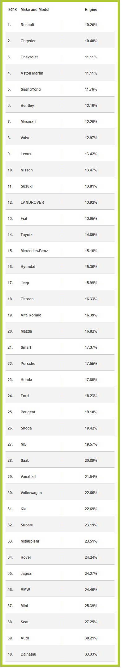 Σύμφωνα λοιπόν με την Reliability Index, στην πρώτη θέση της κατάταξης με τα λιγότερα ποσοστά προβλημάτων βρίσκεται η Renault (10,26%), ενώ ακολουθούν με μικρή διαφορά Chrysler, Chevrolet, Astron Martin και SsangYong στην πρώτη πεντάδα. Εντύπωση προκαλεί ότι Ιαπωνικές μάρκες που έχουν παράδοση στην αξιοπιστία δεν είναι ψηλά στην κατάταξη, ενώ εντύπωση προκαλεί η Daihatsu που βρίσκεται τελευταία και με το υψηλότερο ποσοστό. Σίγουρα θα είχε περισσότερο ενδιαφέρον να υπήρχε μια βαθύτερη ανάλυση με τα μοντέλα και που εμφανίζουν ζημιές για να υπάρχει μια πιο ολοκληρωμένη εικόνα.