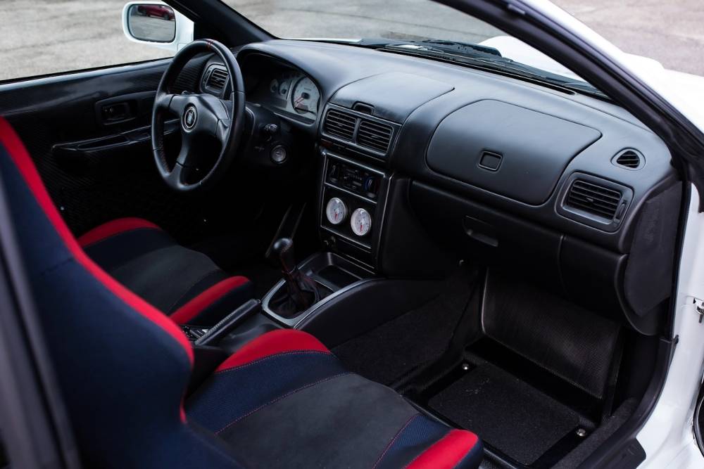 Στο εσωτερικό δεσπόζουν τα μπάκετ της Recaro και το τιμόνι Nardi, όπως και τα aftermarket οργανάκια χαμηλά στο ταμπλό. Όπως βλέπουμε το τιμόνι έχει μετακομίσει στα αριστερά, κατόπιν της ανάλογης μετατροπής που -σύμφωνα με την αγγελία- έχει γίνει σε εξουσιοδοτημένο συνεργείο της Subaru. Το ίδιο ισχύει για όλες τις εργασίες πάνω στο αυτοκίνητο, που περιλαμβάνουν rebuild στον κινητήρα, νέο 5άρι χειροκίνητο κιβώτιο και ανάρτηση, όλα αυθεντικά από τη Subaru Tecnica International.