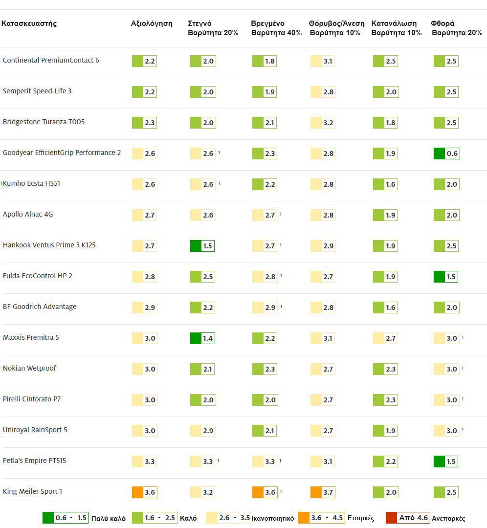 Πάμε να δούμε την τελική κατάταξη, όπως διαμορφώθηκε μετά τις ενδελεχείς δοκιμές των Γερμανών, που περιλαμβάνει κι αρκετές εκπλήξεις, με κάποια μεγάλα ονόματα να βρίσκονται χαμηλά και κάποια άλλα, σχετικά άγνωστα, πολύ ψηλά. Αξίζει να αναφερθεί πάντως, πως μόνο ένα ελαστικό δεν ήταν τουλάχιστον ικανοποιητικό, ενώ κανένα δεν βρέθηκε στο φάσμα του ανεπαρκούς.