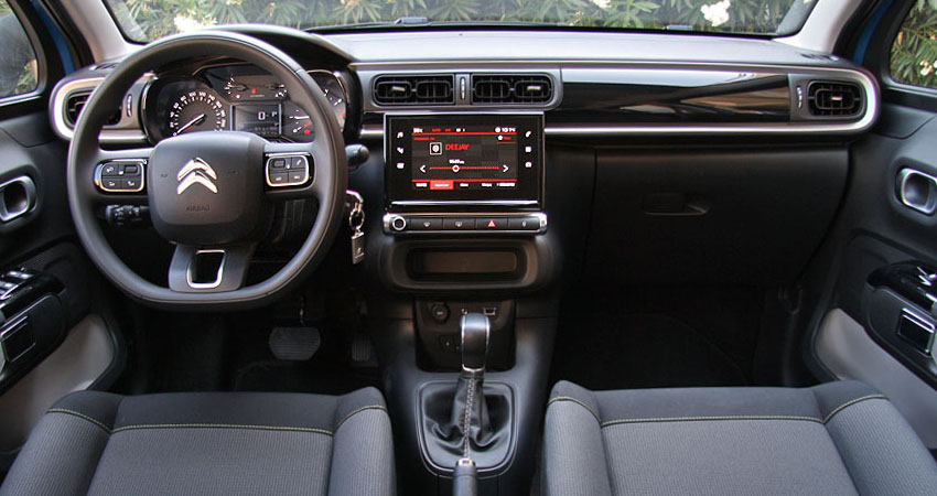 Ο σικ και μοντέρνος σχεδιασμός στο εσωτερικό του νέου Citroen C3 με τις απαλές καμπύλες και επίπεδες επιφάνειες δημιουργούν μια μινιμαλιστική εικόνα, η οποία ενισχύεται και από την έλλειψη πολλών μπουτόν στην κεντρική κονσόλα. Εκεί κυριαρχεί η έγχρωμη οθόνη αφής 7 ιντσών του συστήματος πολυμέσων, στην οποία έχουν ενσωματωθεί διάφορες λειτουργίες του αυτοκινήτου (π.χ. ηχοσύστημα, κλιματισμός, επικοινωνία) και αρχικά χρειάζεται ένα διάστημα εξοικείωσης. Ο οδηγός του C3 θα βρει την κατάλληλη θέση οδήγησης μέσω των πολλαπλών ρυθμίσεων, κάθεται αναπαυτικά και έχει στη διάθεσή του ένα πλήρη ενδείξεων, ευανάγνωστο αλλά και λιτό αισθητικά πίνακα οργάνων. Ποιοτικά, το εσωτερικό αποτελείται από σκληρά πλαστικά, ενώ το διάκοσμο αναβαθμίζουν τα διάφορα διακοσμητικά. Από πλευράς χώρων, τέσσερις ενήλικοι θα μετακινηθούν χωρίς παραχωρήσεις, έχοντας στη διάθεσή τους ένα τετραγωνισμένο και μεγάλο (για την κατηγορία) πορτ μπαγκάζ 300 λίτρων.