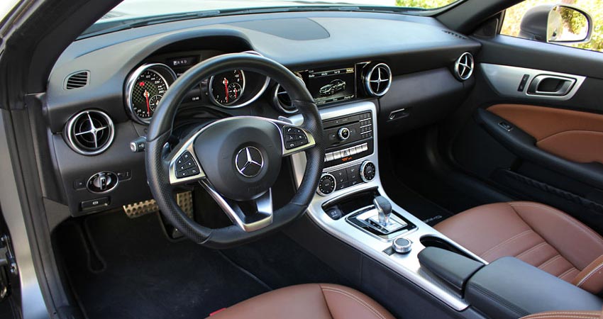 Στην καμπίνα των επιβατών, η αποκλειστικά διθέσια Mercedes SLC διατηρεί ένα πολύ ποιοτικό εσωτερικό, με υλικά ανώτερης ποιότητας που πείθουν απόλυτα με τη συναρμογή τους. Σχεδιαστικά, οι αλλαγές σε σχέση με την τελευταία SLK εντοπίζονται στο πιο σπορτίφ τριάκτινο τιμόνι με επίπεδο κάτω τμήμα, τα νέα σχεδίασης καθίσματα (με πανέμορφα καφέ δέρματα στο μοντέλο της δοκιμής), αλλά και στη μεγαλύτερη (7 ιντσών) οθόνη για το σύστημα πολυμέσων μέσα στην κεντρική κονσόλα. Ο οδηγός, κάθεται σχετικά χαμηλά και δεν έχει πρόβλημα με το διαθέσιμο ύψος, όντας παράλληλα σε θέση να βρει εύκολα την επιθυμητή θέση οδήγησης. Ευχάριστο στοιχείο αποτελεί ότι λόγω και της θέσεως του χειρόφρενου, κλασικά στα αριστερά και εμπρός του οδηγού, υπάρχουν αρκετές θήκες για μικροαντικείμενα στο τούνελ της κονσόλας που προάγουν την πρακτικότητα. Το πορτ-μπαγκάζ, με 330 λτ. χωρητικότητας όταν η οροφή είναι κλειστή είναι επιπλέον από τα μεγαλύτερα της κατηγορίας (225 λτ. με την οροφή ανοικτή).