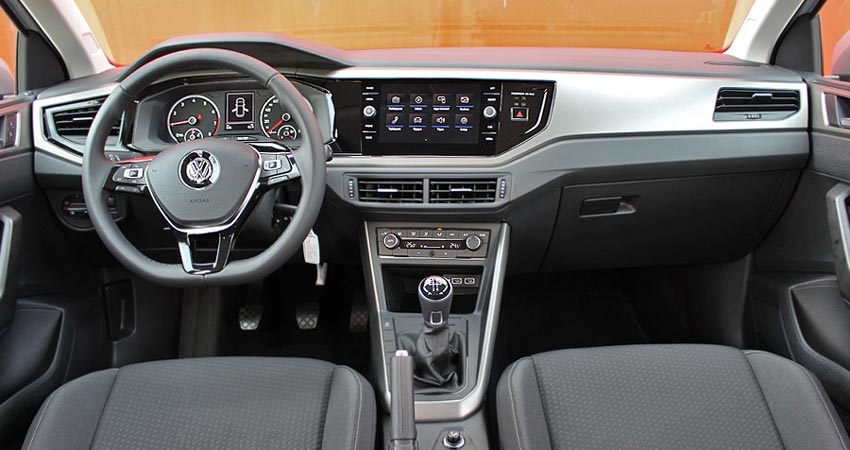 Το εσωτερικό του νέου VW Polo έχει κορυφαία ποιότητα. Το ταμπλό καλύπτεται από παχύ μαλακό υλικό από το παρμπρίζ έως κάτω από το διακοσμητικό φιλέτο, το οποίο μπορεί να αλλάξει και χρώμα και είναι εξαιρετικό σε φινίρισμα και σε όψη. Όλα τα υλικά είναι καλά δεμένα μεταξύ τους και δεν ακούς τον παραμικρό τριγμό. Η εργονομία είναι προσεκτικά μελετημένη με όλα τα χειριστήρια σε σωστή θέση και μία μεγάλη οθόνη αφής στο κέντρο του ταμπλό η οποία πραγματικά απογειώνει την εικόνα του εσωτερικού. Ο πίνακας οργάνων είναι ευανάγνωστός και πλήρης ενδείξεων (προαιρετικά μπορεί να τοποθετηθεί ψηφιακός πίνακας οργάνων), ενώ η θέση οδήγησης θα βολέψει τους πάντες καθώς έχει αναπαυτικό κάθισμα με μεγάλο εύρος ρυθμίσεων για αυτή αλλά και για το τιμόνι (σε ύψος και απόσταση). Πιο χαμηλά τα πλαστικά είναι σκληρά, χωρίς όμως να είναι φθηνά, ενώ η συναρμογή τους είναι και σε αυτή την περίπτωση τέλεια. Οι χώροι, ως απόρροια και των αυξημένων διαστάσεων, είναι αυξημένοι σχέση με το απελθόν μοντέλο. Τέσσερις ενήλικες ακόμη και άνω του κανονικού αναστήματος βολεύονται άνετα, αλλά μεσαίος στο πίσω κάθισμα θα δυσανασχετήσει λόγω του τούνελ στο δάπεδο. Χώροι για μικροαντικείμενα υπάρχουν αρκετοί, ανάμεσα στα εμπρός καθίσματα υπάρχουν ποτηροθήκες, οι τσέπες των θυρών είναι μεγάλες εμπρός και ικανοποιητικές πίσω. Ο χώρος αποσκευών είναι στα 355 λίτρα (τιμή κορυφαία για την κατηγορία) με μεγάλο άνοιγμα και με την αναδίπλωση των πίσω καθισμάτων φτάνει στα 1.125 λίτρα.